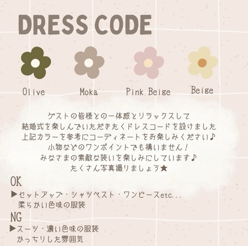 招待状でテーマを明確に伝えましょう。「○○をテーマにした結婚式」と明記し、どんな雰囲気なのか分かるようにします。ドレスコードがある場合は、具体的に記載。「カジュアルな服装で」「○○色を身につけて」など、参加しやすい指示を。