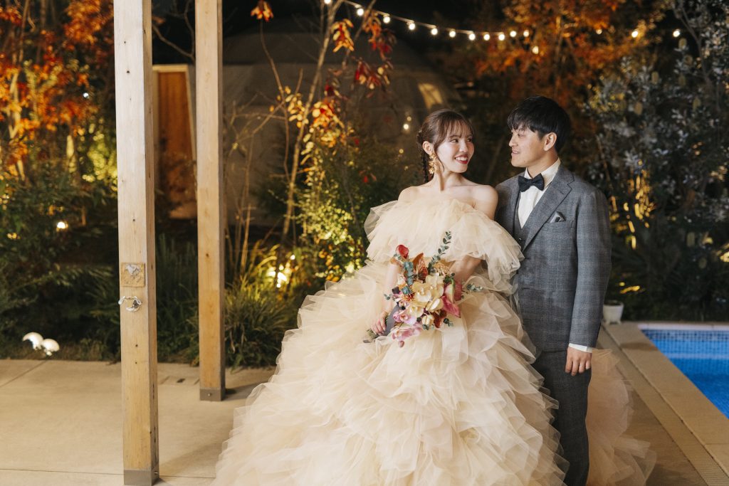 夜のガーデンで、星空を見上げながら語り合う時間。昼間とは違う、親密で特別な雰囲気が生まれます。